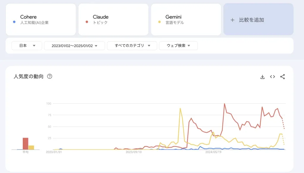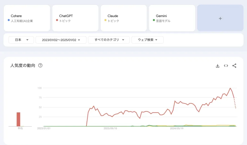 2025年1月2日現在、Google Trendsのデータによると、ChatGPTやその他の人気生成AIと比べて検索数は少ない状況です。しかし、CohereはAWS Bedrockで利用可能なモデルの一つとして採用されており、他の生成AIとの差別化ポイントを持っています。今回は、実際に利用してみた感想をお伝えします。