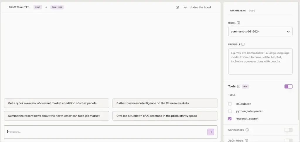 CohereはChatGPTのようなマーケットプレイスを持たないため、日常的な利用をターゲットにしているわけではなく、主にアプリケーションへの組み込みを想定している印象を受けました。